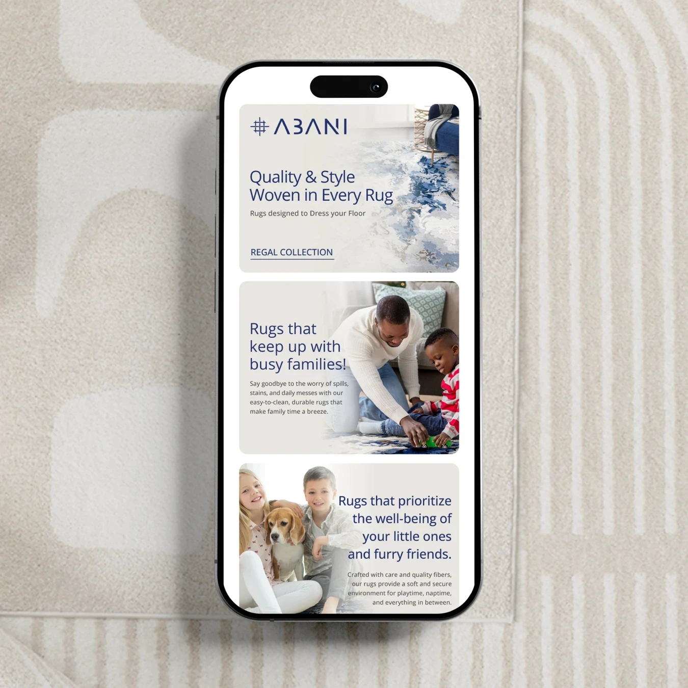Design Amazon A+ Content that reflects Abani’s elegant brand identity while remaining clear, consistent, and optimized for conversion. The challenge was to create content that could adapt across multiple rug collections, colors, and styles, while aligning with both the brand’s visual language and Amazon’s platform guidelines.